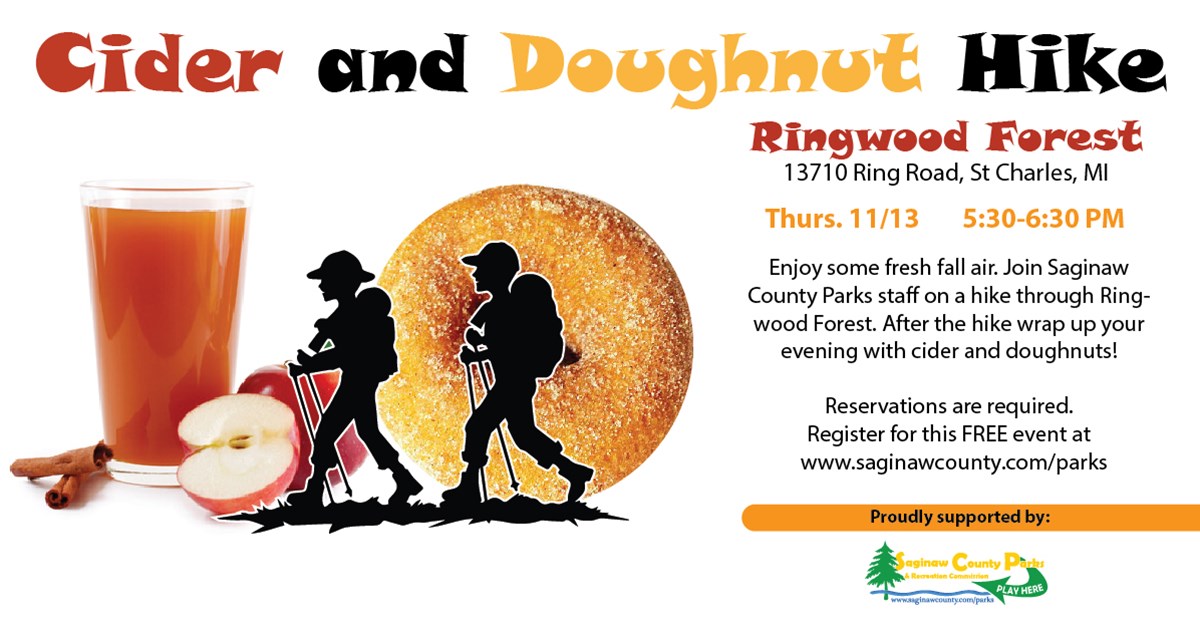 Join parks staff for a refreshing fall hike through Ringwood Forest, where you can breathe in the crisp autumn air and crunch through colorful leaves. After the hike, unwind with warm cider and delicious doughnuts! Register at www.saginawcounty.com/parks. Cost: Free