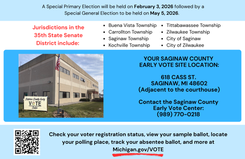 Saginaw County Early Voting Center Opens this Saturday for the February 3rd Special Election for the 35th State Senate District